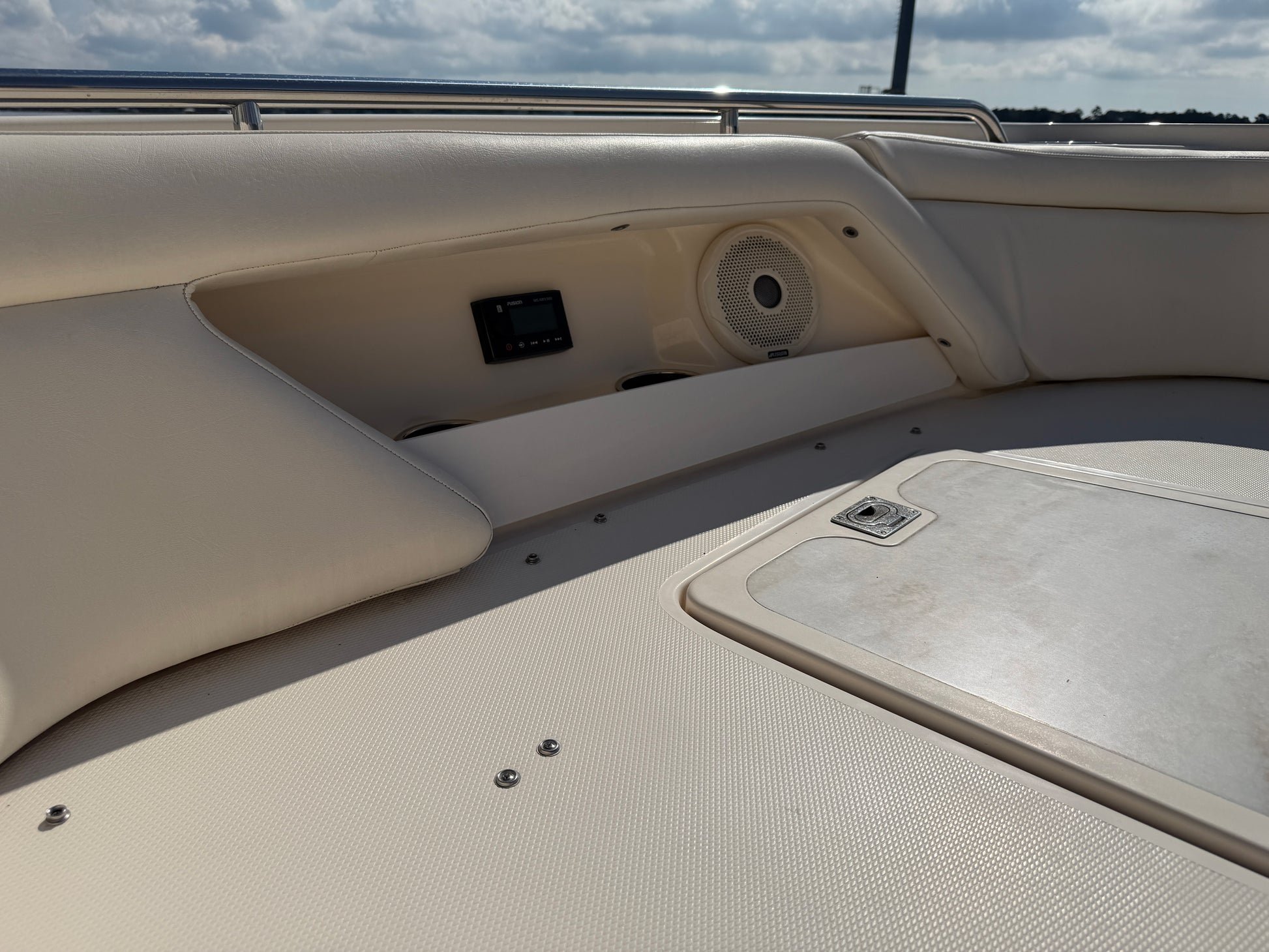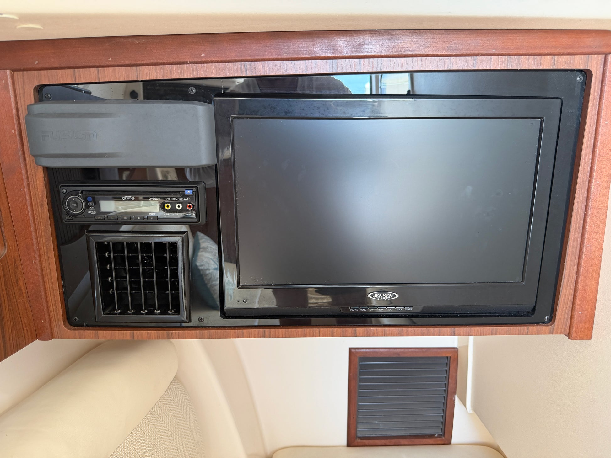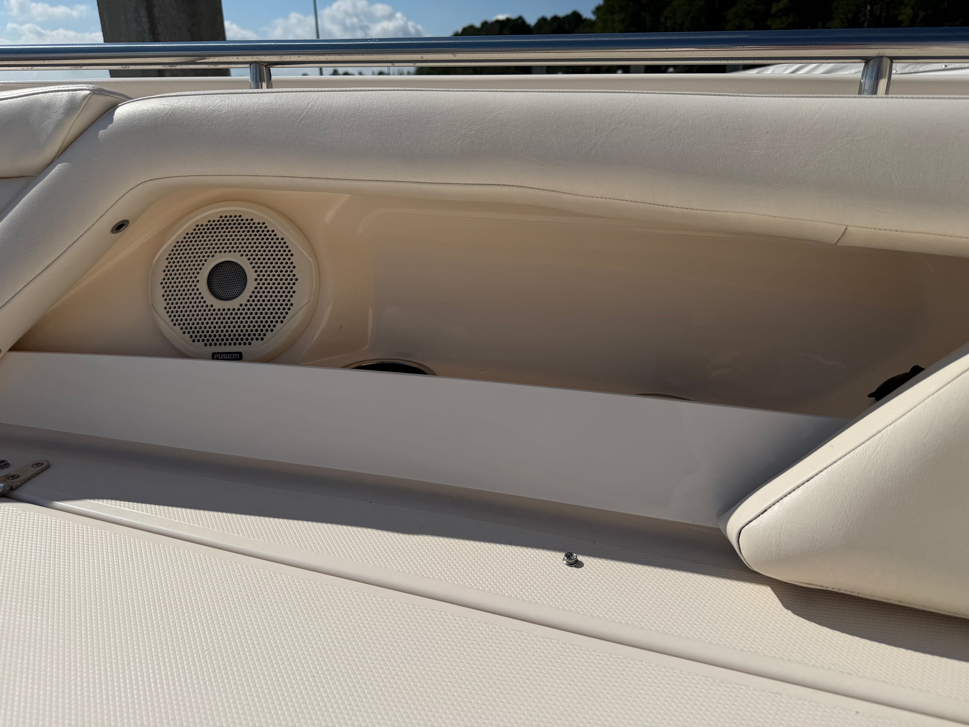 - Stereo system w/AM/FM tuner, VHF receiver, MP3 auxiliary audio connections/amplifier, Bluetooth®, remote control & fold down storage; speakers - aft (2), bow (2) & helm (2)
