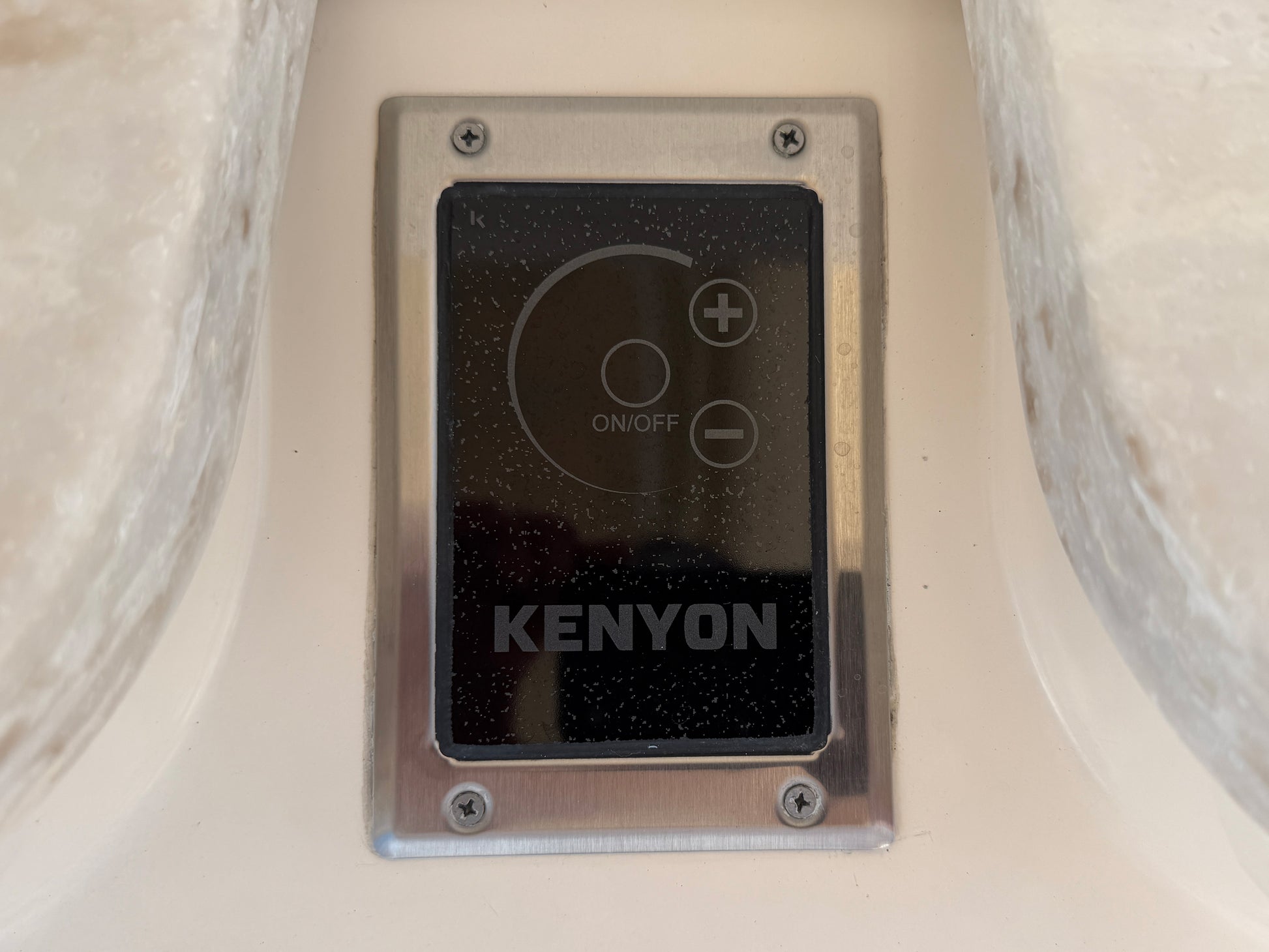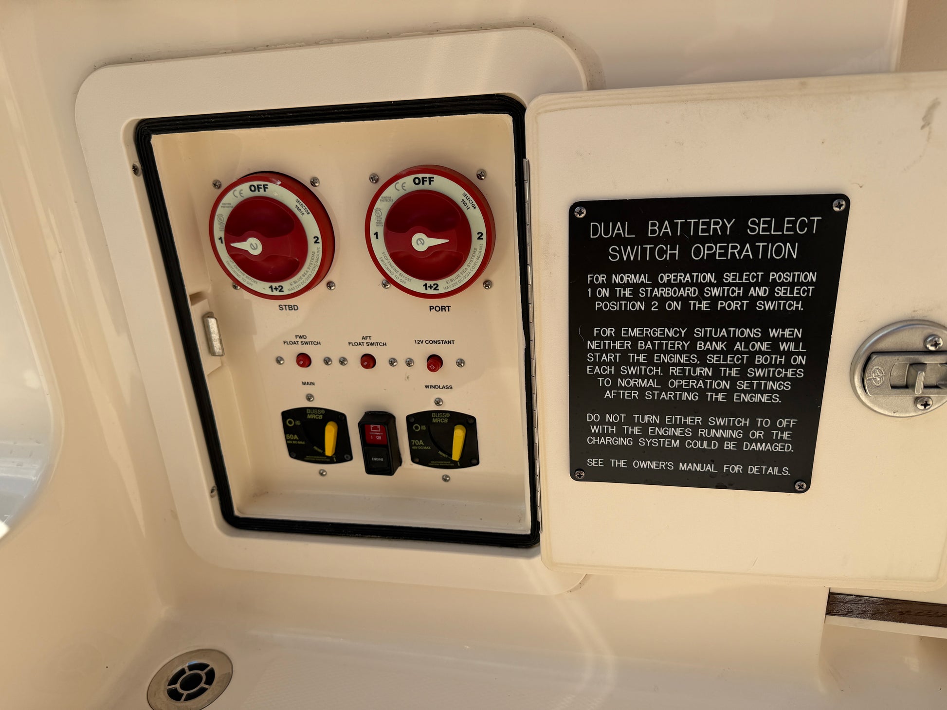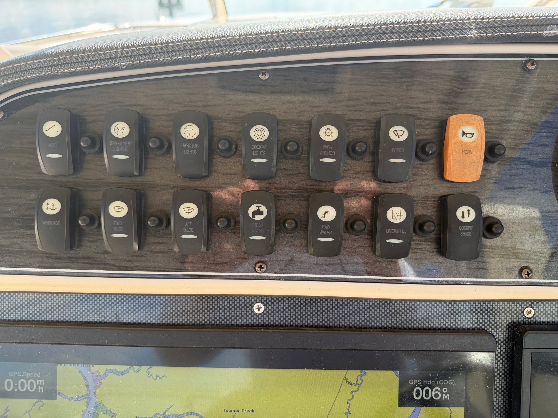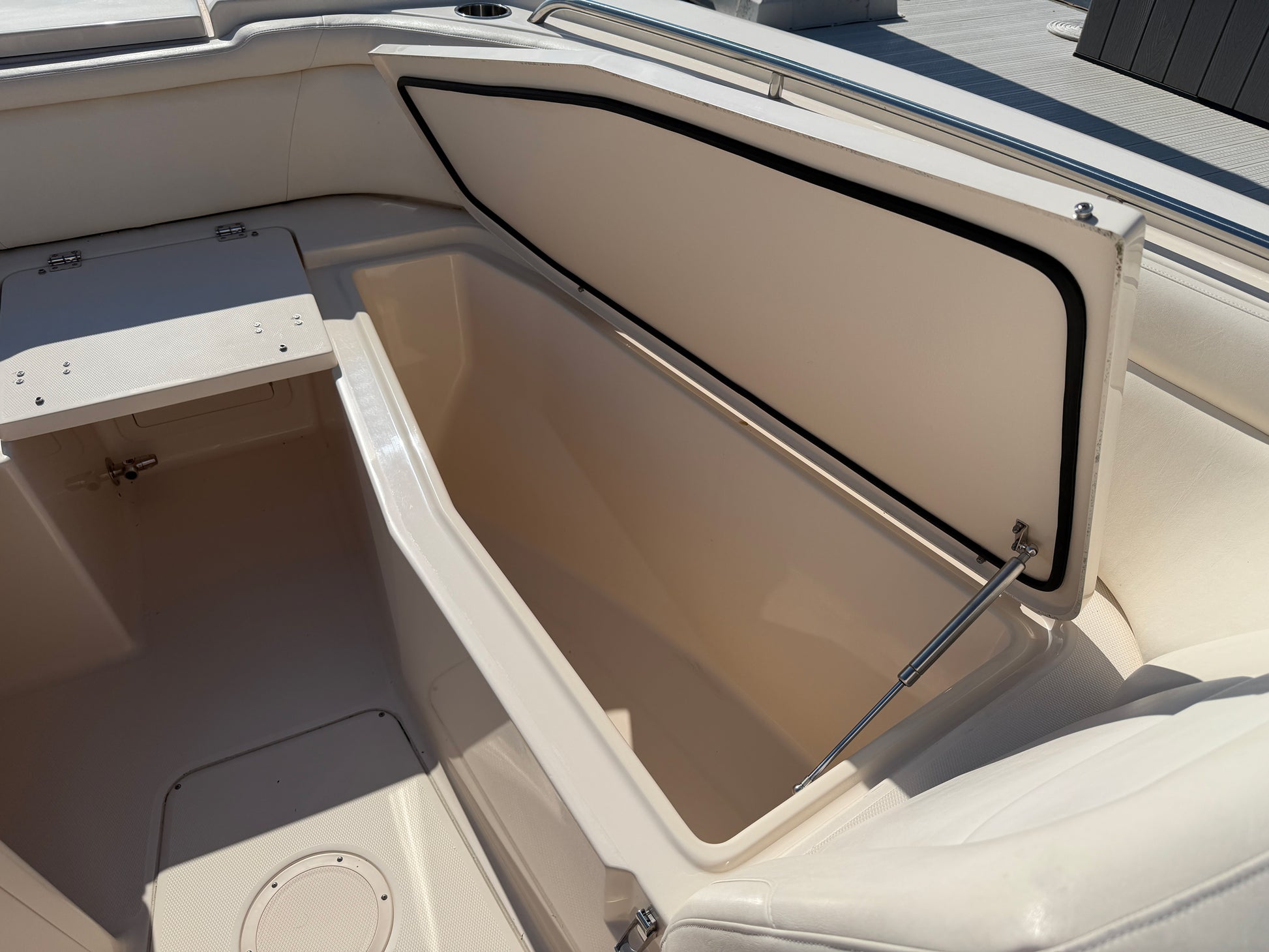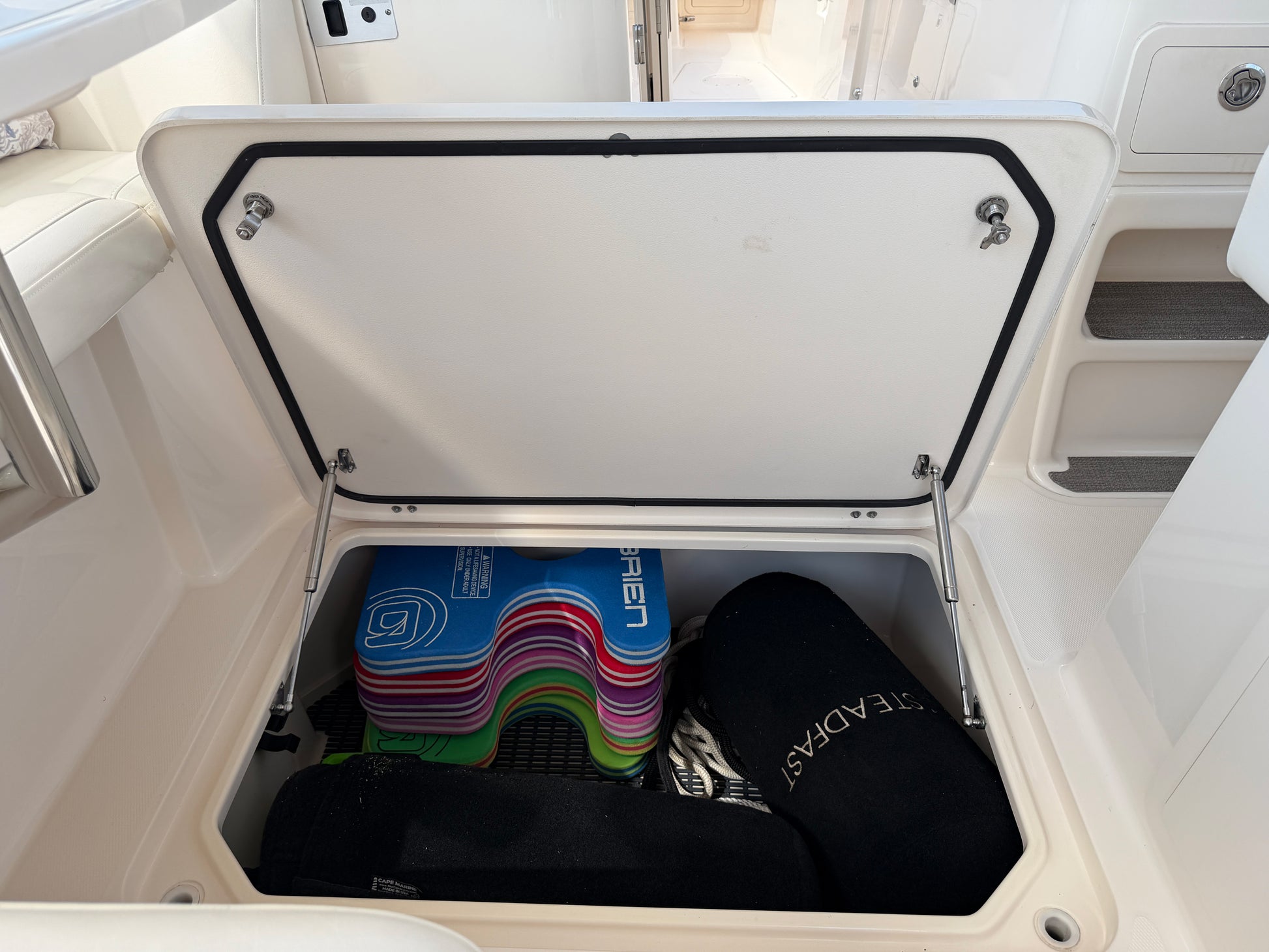- Wet bar w/refrigerator, sink, storage drawers, trash bin, drink holders (2) & fire extinguisher holder (integrated with electronically operated helm seat)