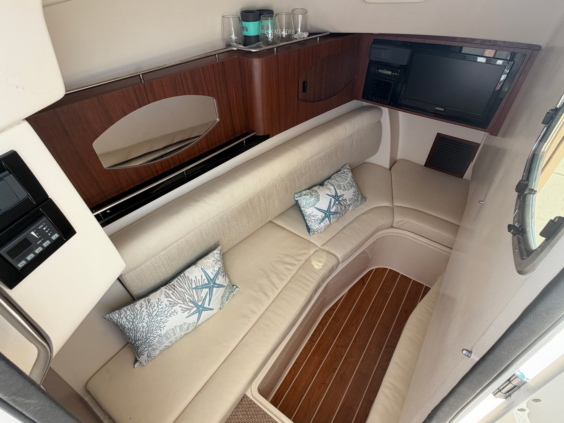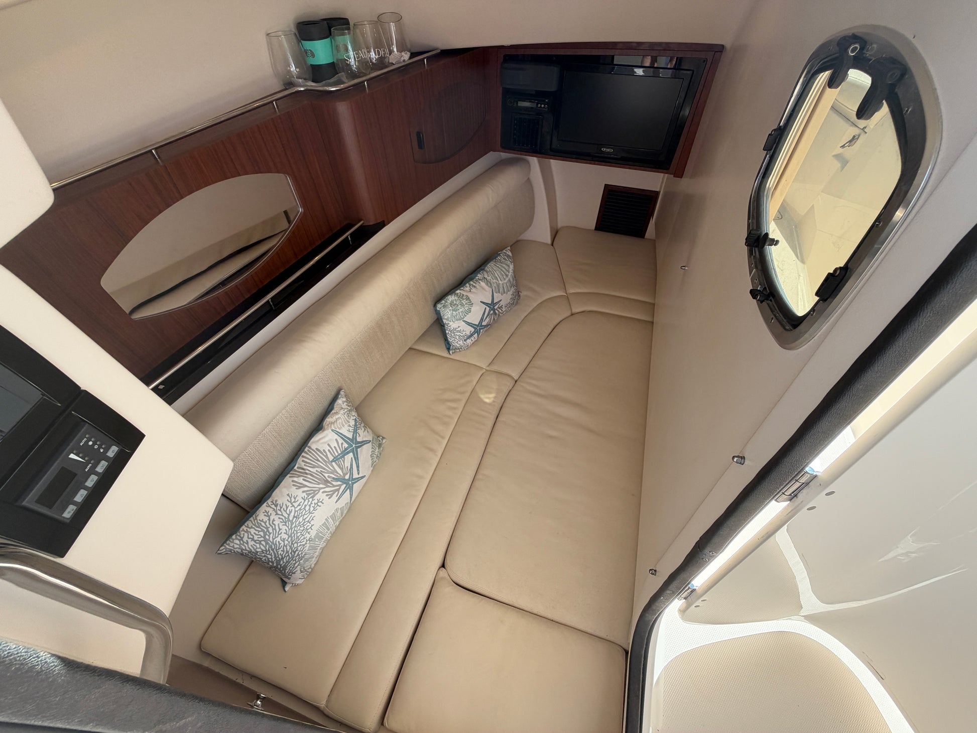 - Portside cabin console w/electronically operated sliding berth, bench seat, closet, drawers, mirror, lighting, tinted screened window & bulk storage