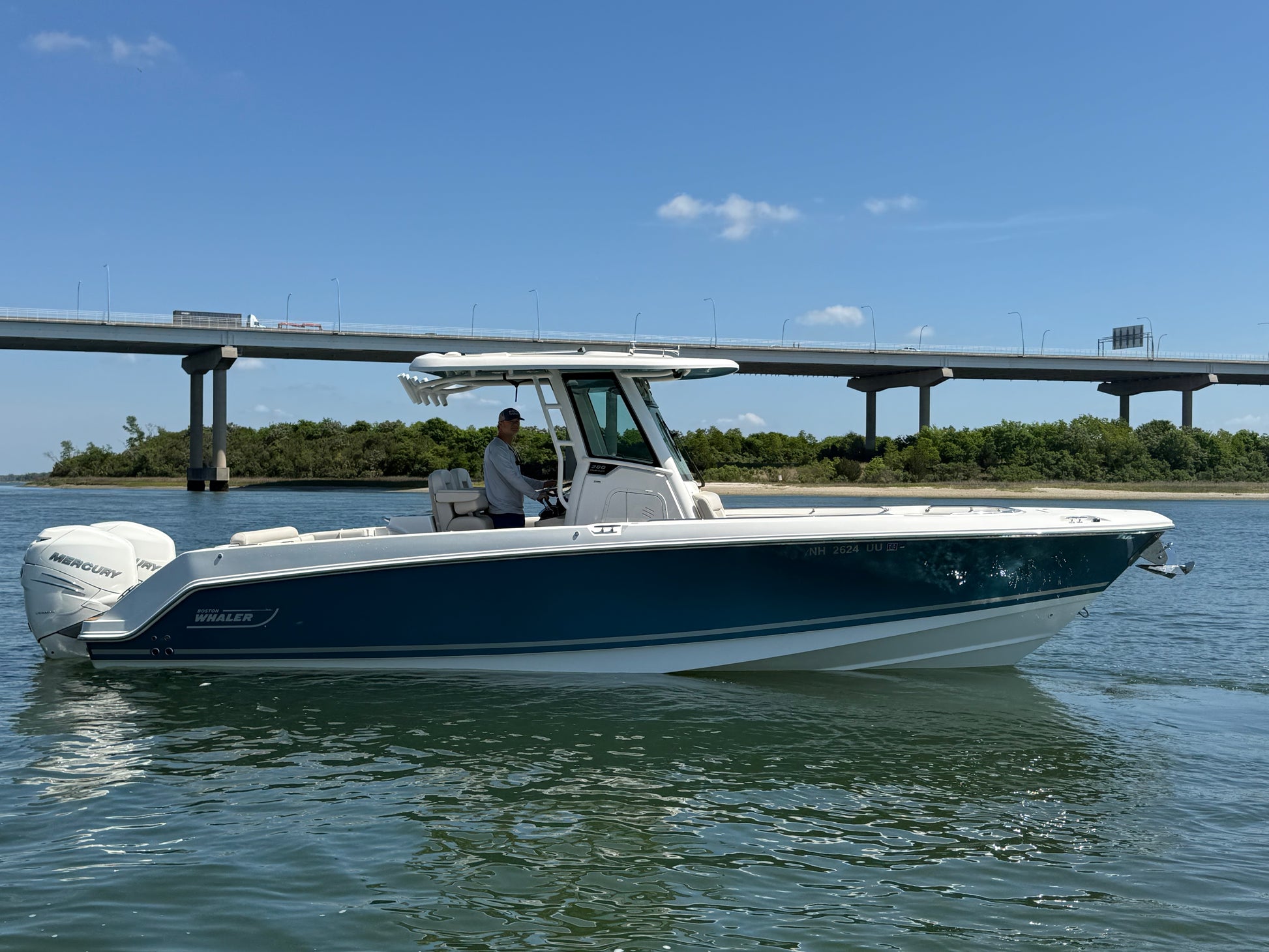 2023 Boston Whaler 280 Outrage powered by twin Mercury 350 L6 Verados with Joystick Piloting, Skyhook, Fly by Wire Controls, and Electronic Steering.
