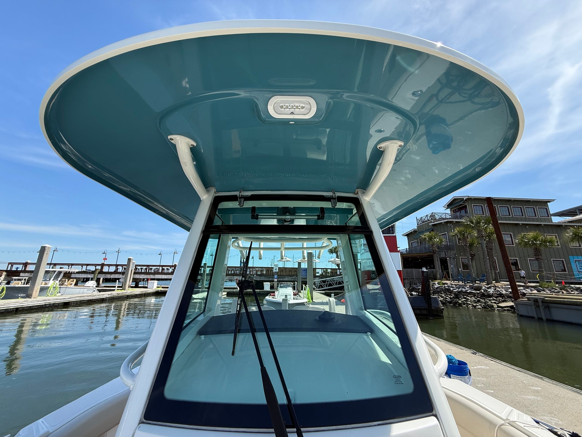 Standard Equipment and Factory Options includes Abaco Blue Hull Color, Hard Top, Abaco Blue Underside to Match Hull, White Powder Coat, Glass Enclosure with Vent, Vacuflush Head, Overboard Waste Discharge, Anchor Windlass with Remote, Llebroc Helm Seats with Flip up Bolsters, Leaning Post Livewell, Sliding Yeti Cooler, Forward Seating, Forward Console Lounge, Full Cushion Package, Fold Out Stern Seat, Dive Door with Removable Ladder, Transom Door with Swim Ladder, Freshwater Sink, (2) In Deck Fishboxes with Macerator Pumps, Lenco Trim Tabs with Indicators, (2) Freshwater Showers, and a Full Custom T-Top Boat Cover.