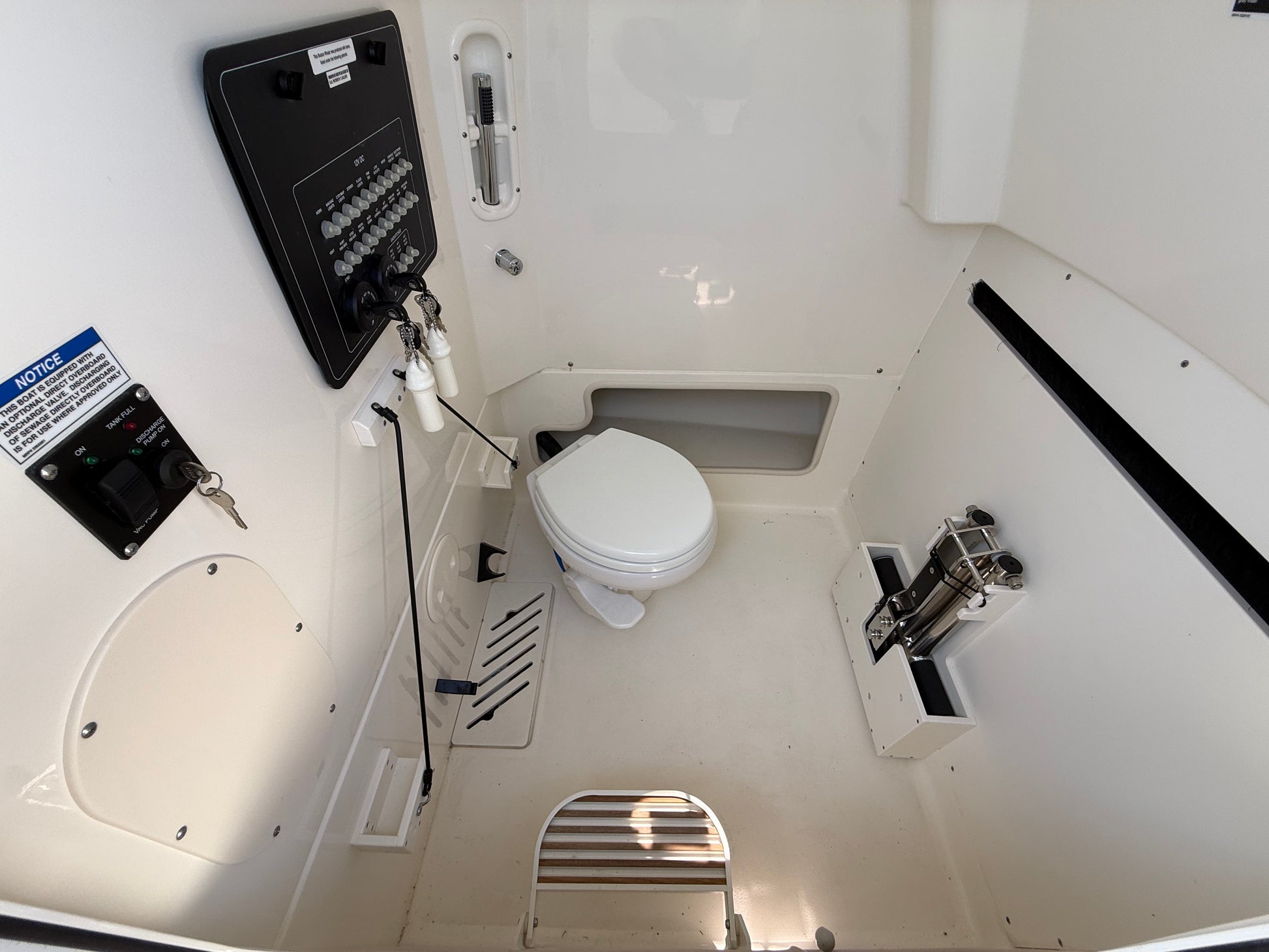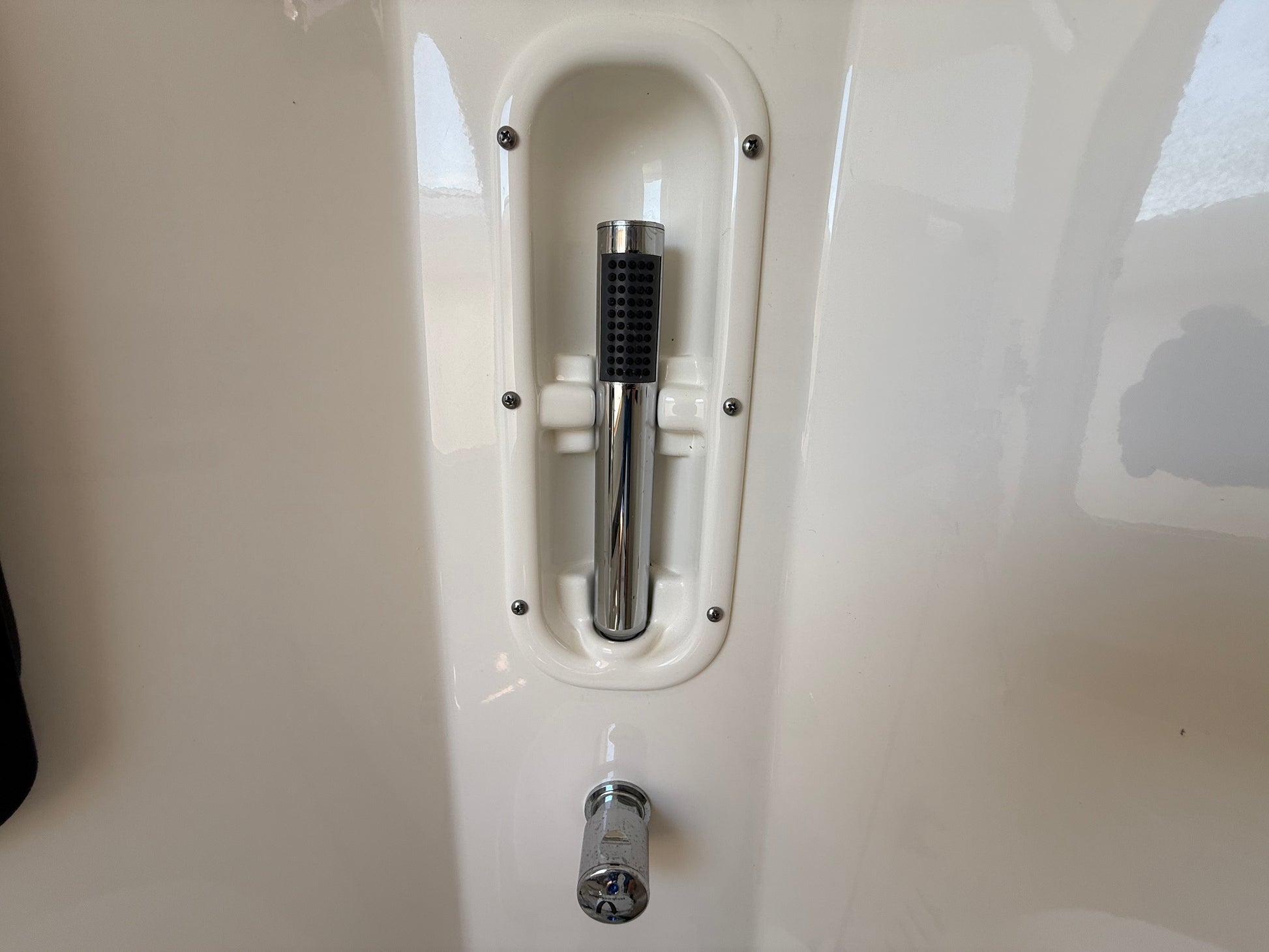 - Freshwater system with 26-gallon tank, sink at leaning post, transom shower, and anchor washdown