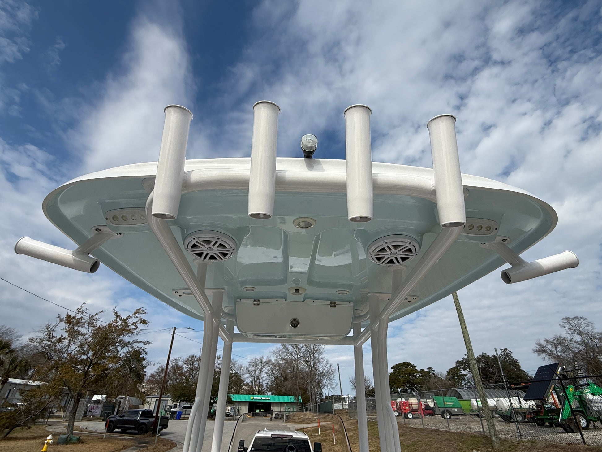 Standard Features and Factory Options include Seakeeper RIDE, Hard Top, White Powder Coat Package, Leaning Post with Bolsters, Aquarium Style Livewell, Freshwater Washdown, Raw Water Washdown, 2 Bank Automatic Battery Charger, and Custom Cover Package.